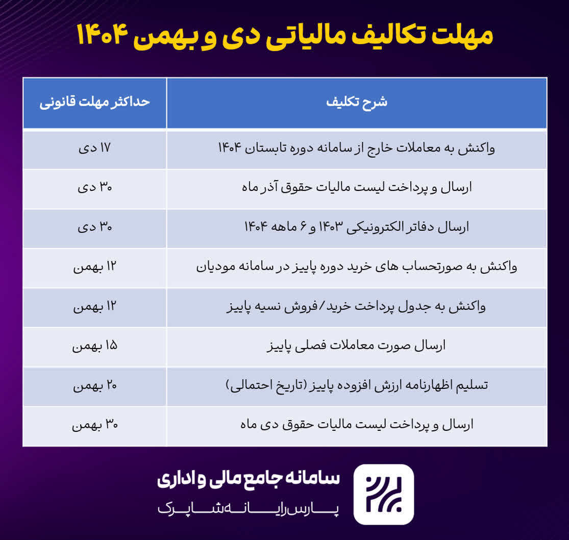 📌 مهلتهای مهم مالیاتی دی ماه ۱۴۰۴